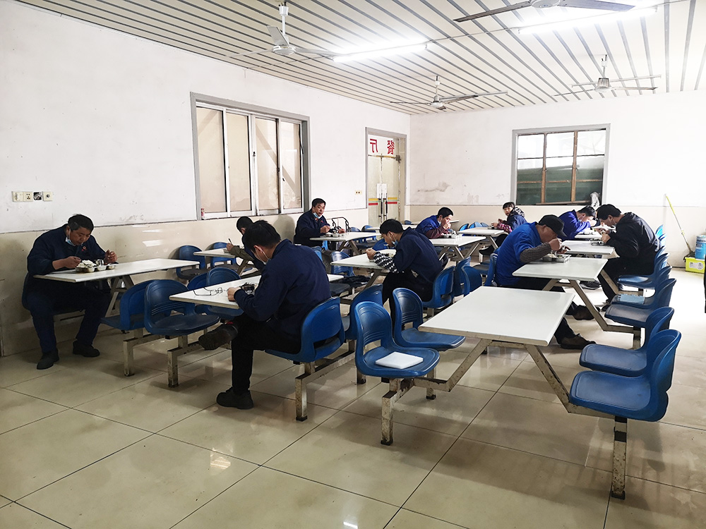 食堂采用分批分餐制,全新的餐具分别激光打上编号,一人一号,报号取餐,餐具集中消毒清洗,让全体员工安心复工,放心用餐。