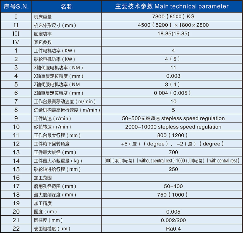 4、砂轮架进给有伺服电机驱动滚珠丝杠运动,导轨为双V型高刚性高精度滚柱导轨,工作台往复运动同样有伺服电机驱动滚珠丝杠运动,导轨采用高刚性高精度滚动直线导轨。