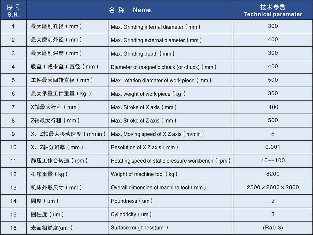 1、本机床为二轴二联动数控立式内(或外)圆磨床,能对零件的内(外)圆或台阶孔等多表面的磨削。